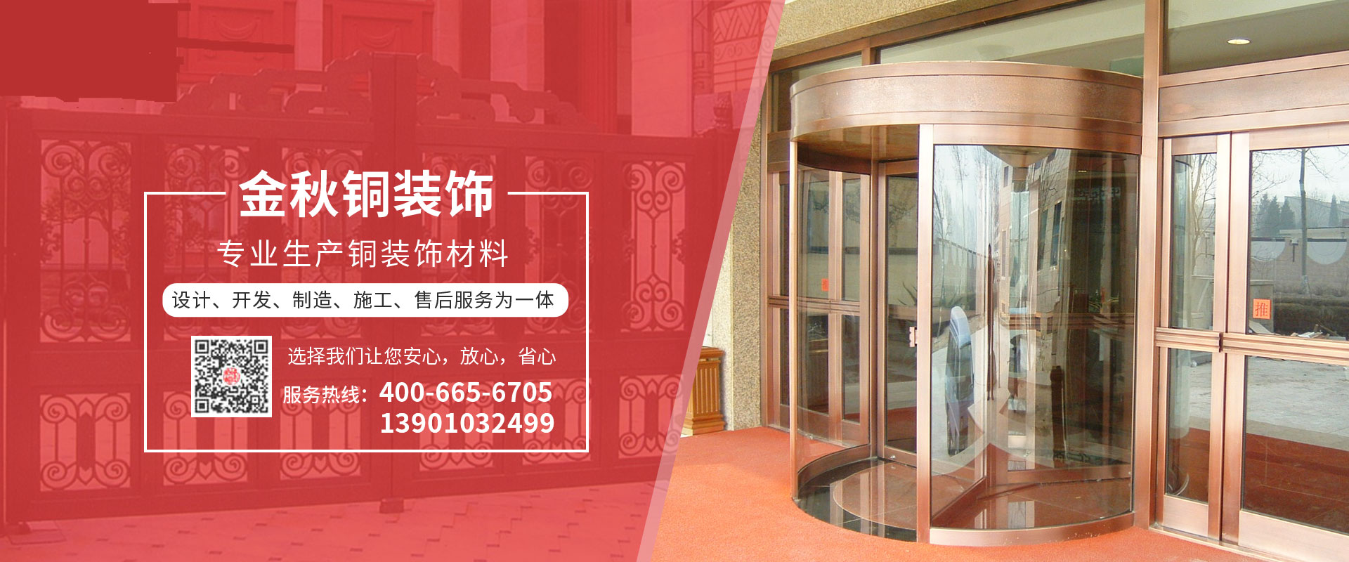 北京金秋銅裝飾材料有限公司是專業(yè)生產(chǎn)銅裝飾材料及設(shè)計(jì)、開(kāi)發(fā)、制造、施工、售后服務(wù)為一體的大型綜合企業(yè)。可承接建筑銅裝飾工程及五星級(jí)酒店、別墅、博物館、樓樘管所等高檔銅裝飾項(xiàng)目;生產(chǎn)各種規(guī)格的旋轉(zhuǎn)門、平滑門、別墅門、電控門、工藝門、旋轉(zhuǎn)護(hù)欄、屋頂銅飾防水瓦、浮雕壁畫(huà)......